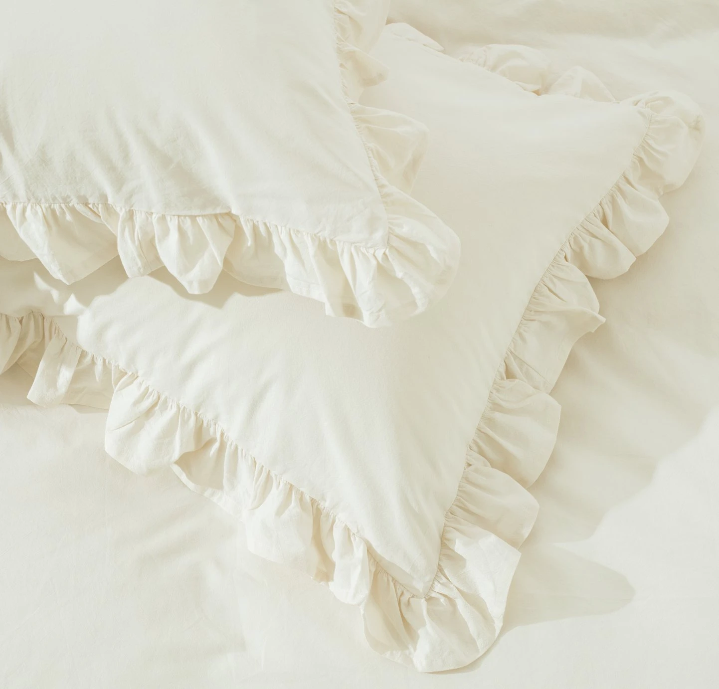 Made from 100% cotton this lovely bedding set is absolutely delightful to sleep in. Crisp but luxurious and soft. With a frill border on 3 sides of the cover and a full border on each pillow, it offers a romantic and timeless look.