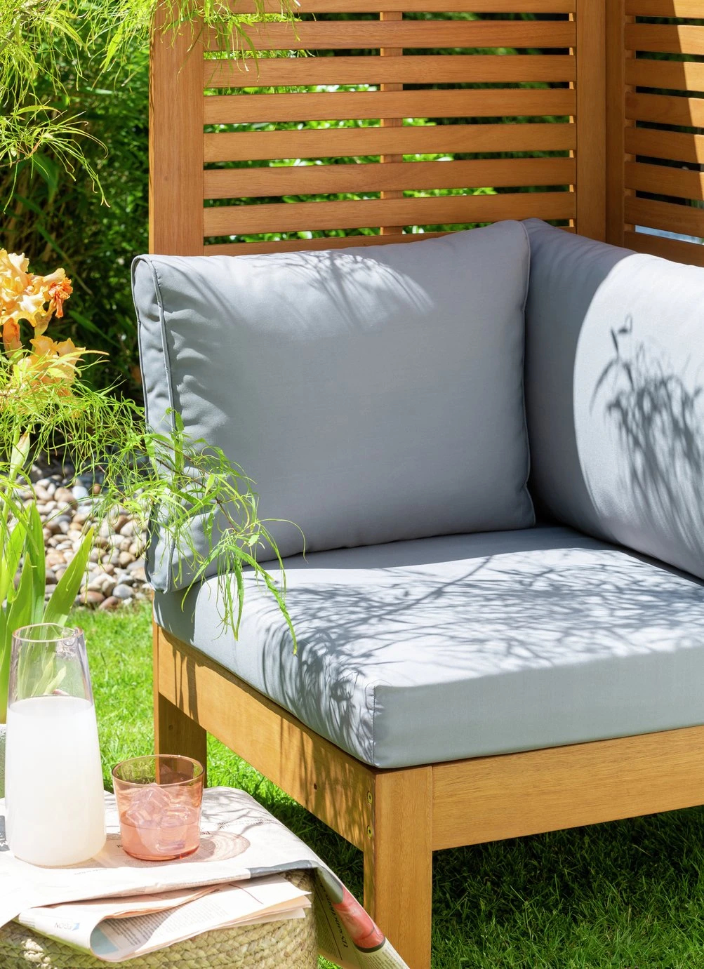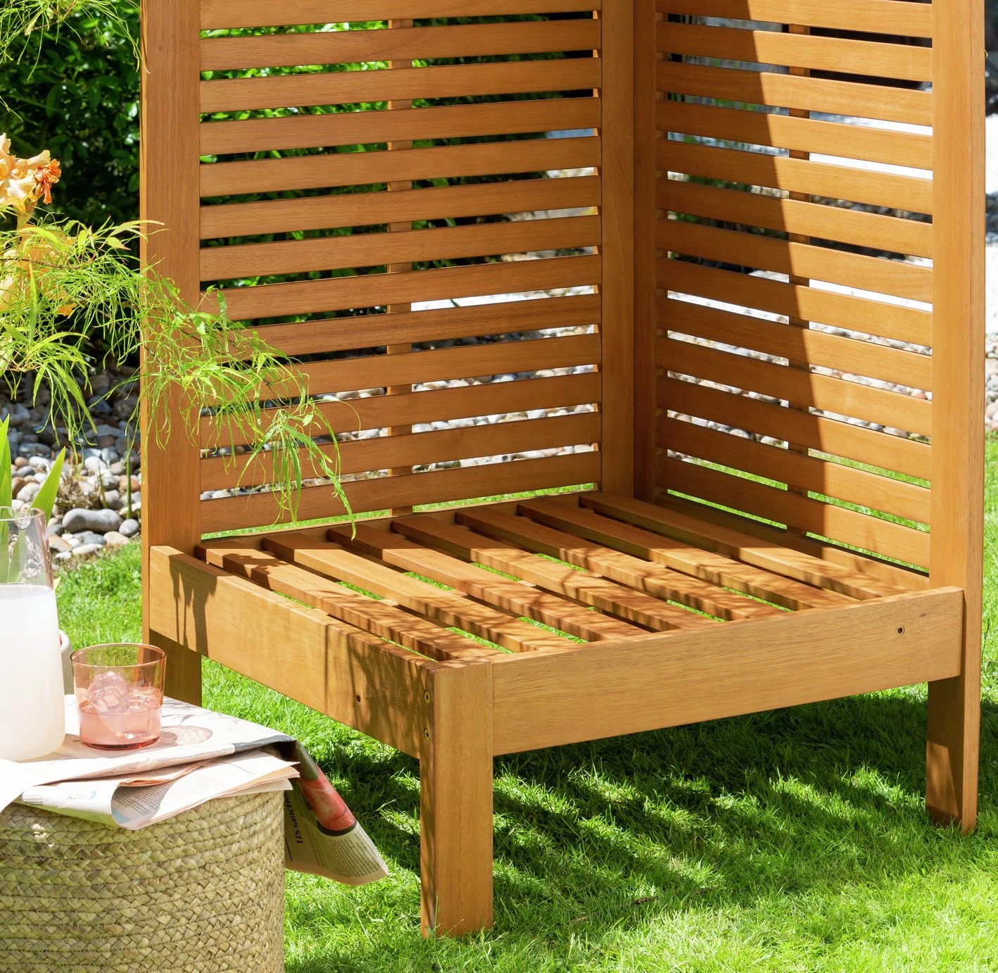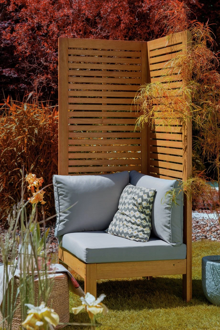 Outdoors is the new indoors. Enjoy some alfresco relaxing with our smart, high-back seat bench. It's very versatile. Stand it against a wall and let flowering plants or vines climb the sides or use it to divide a space and create a small private area. Add a small table or two and Samoa is perfect for entertaining or cocktail spot in the sun for drinks with friends. Made from solid wood with easy clean, stain-resistant polyester cushions.